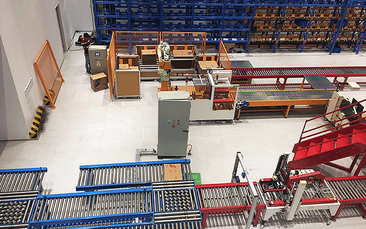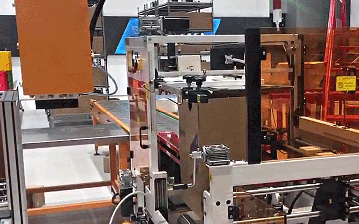 自動拆箱機自動完成開箱、成形、下底折葉折曲。并現時完成下部分膠帶粘貼,將疊成紙板的箱板自動打開,箱子底部按一定程序折合,并用膠帶密封后輸送給裝箱機的專用設備。